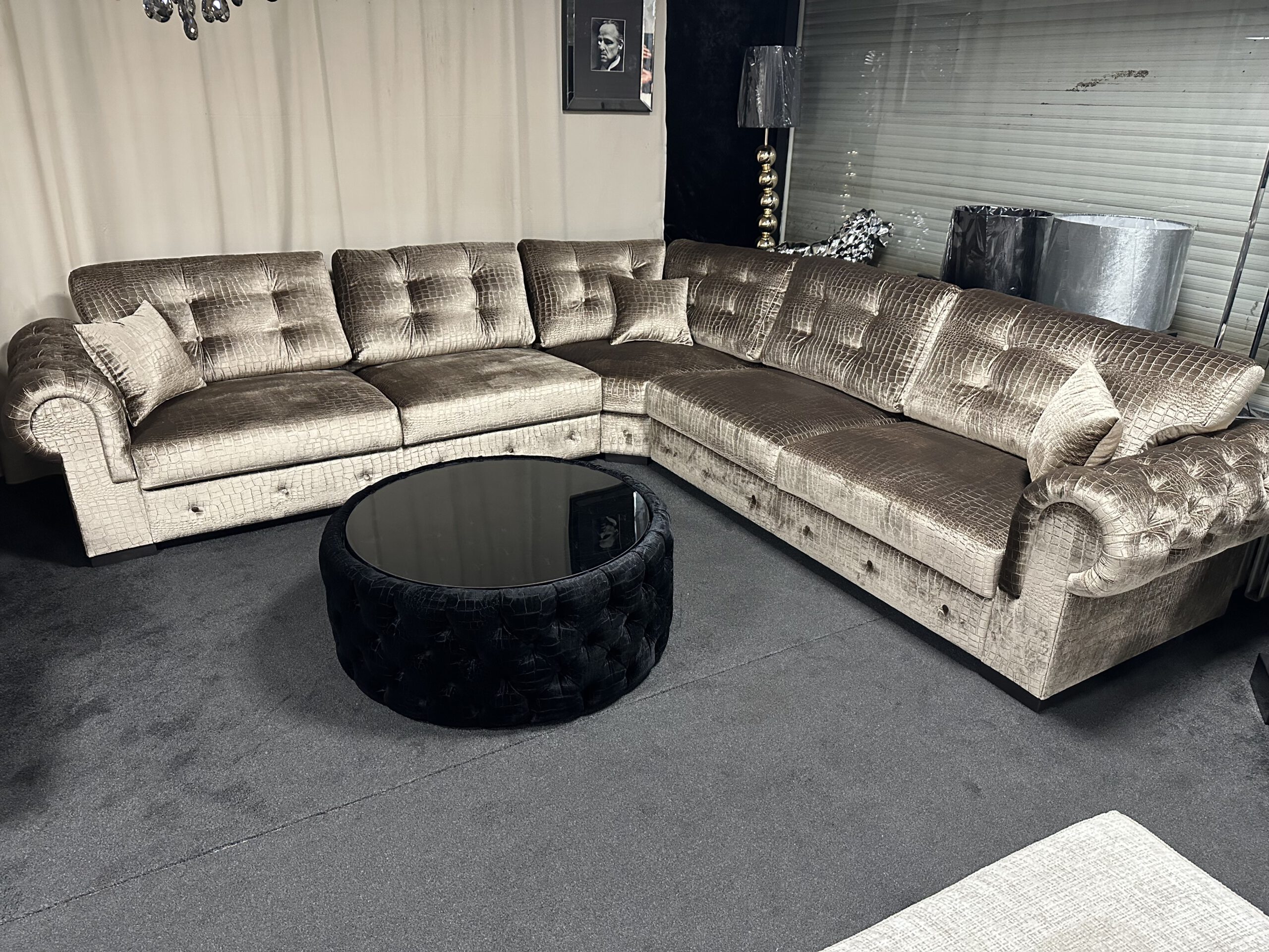 Hoekbank CHESS met kwaliteit koudschuim vullingen in croco goudbruin stof incl. sierkussens.