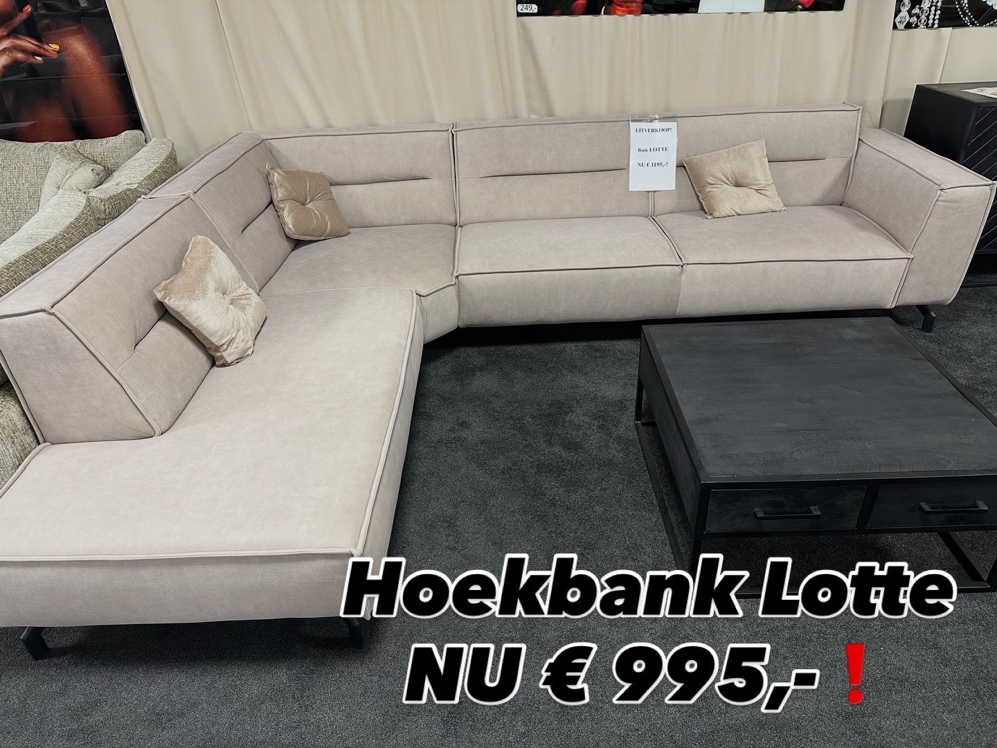 Hoeklounge bank LOTTE in taupe velvet stof met vaste koudschuim vullingen.
