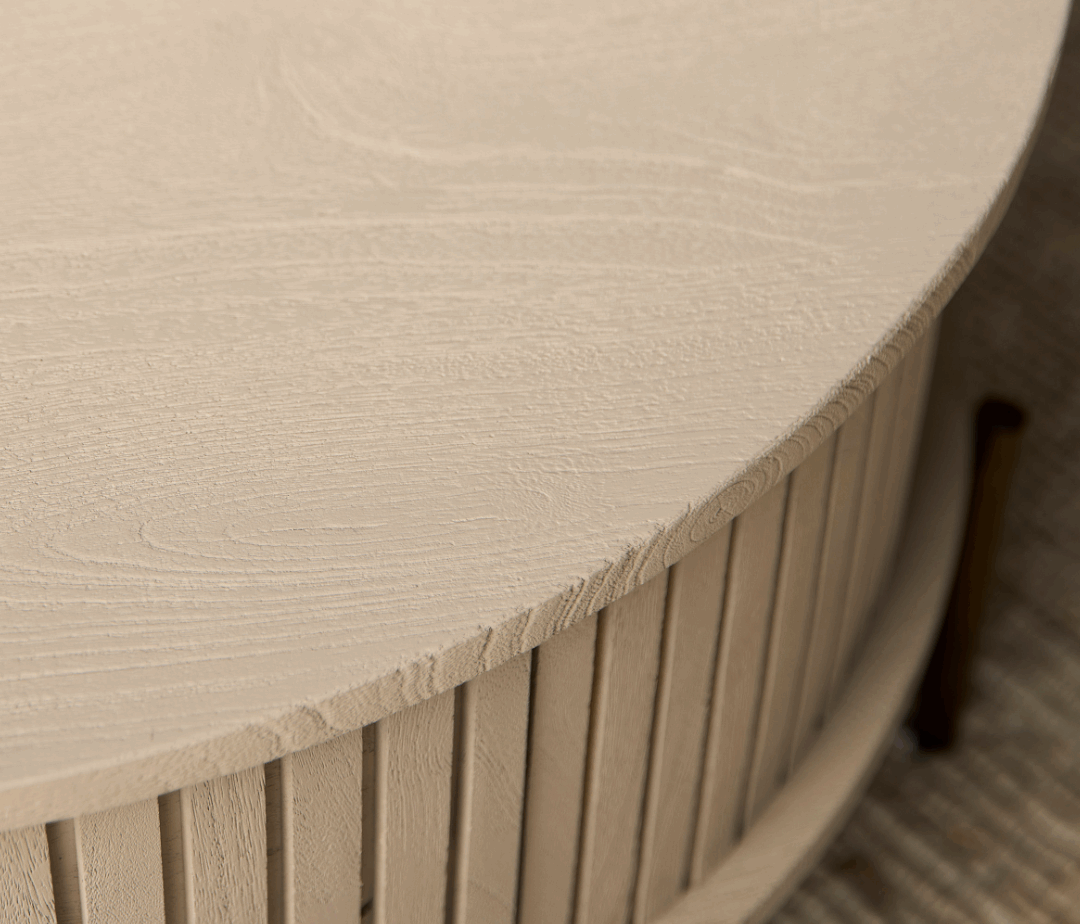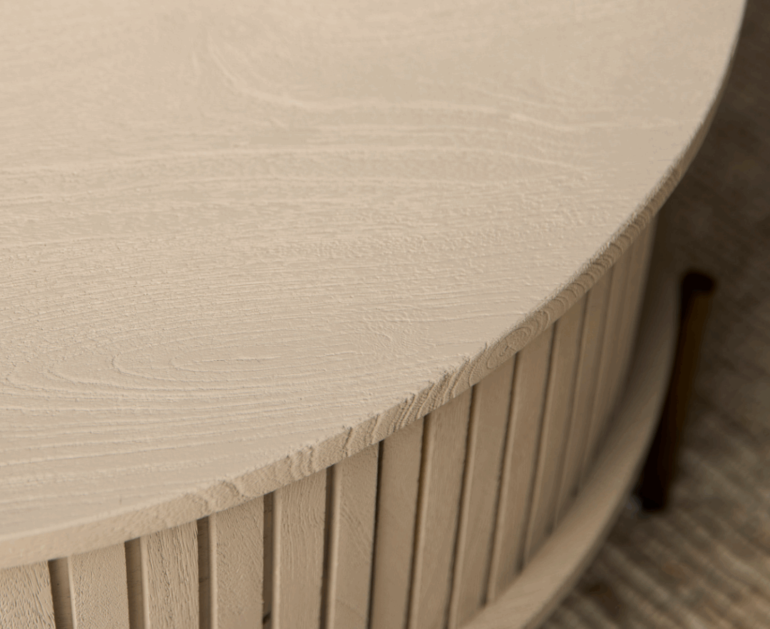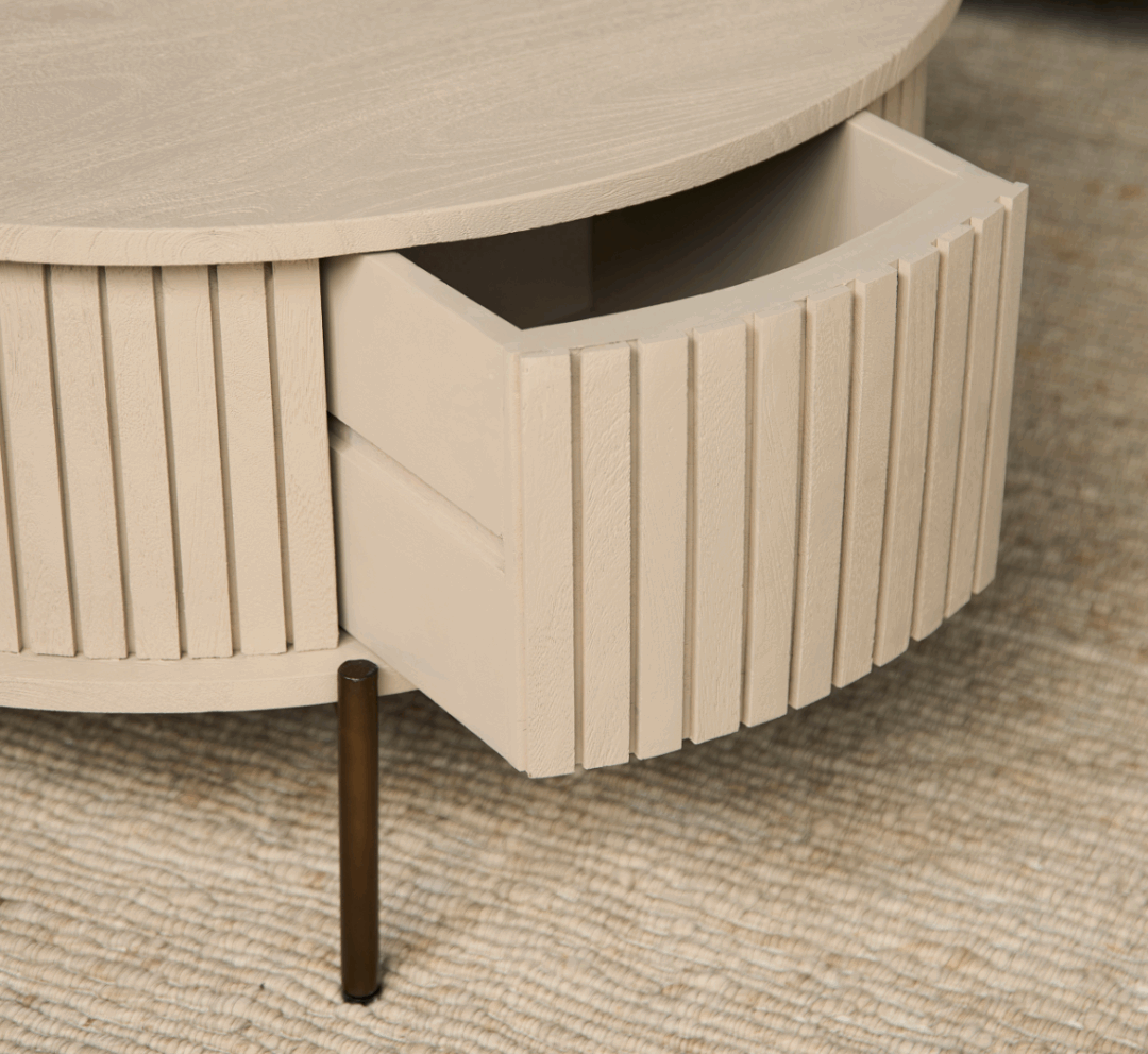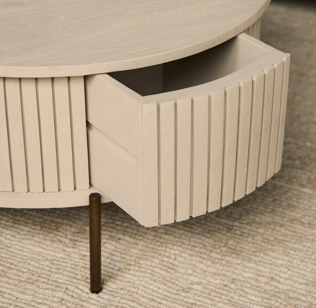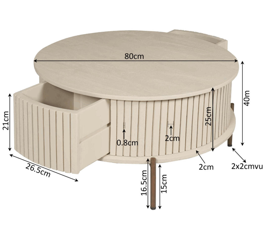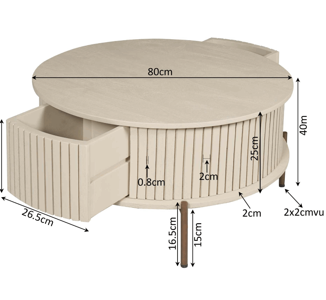 Salontafel Madison Rond is gemaakt van mangohout. De metalen poten zijn afgewerkt met een licht gezandstraald lak. Dit model is voorzien van twee lades.