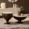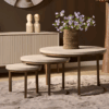 De 3-delig tafeltjes zijn gemaakt van mangohout en met stalen poten en afgewerkt met een zwarte lak.